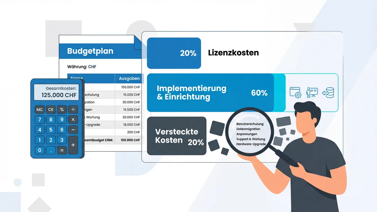 Versteckte Kosten umfassen Datenbereinigung und Migration (5'000 bis 50'000 USD), Schulung und Change Management (2'000 bis 20'000 EUR), Integrationen mit bestehenden Systemen (3'000 bis 30'000 EUR), Premium-Support (20 bis 30 Prozent der Lizenzkosten) und laufende Optimierung nach dem Go-Live.