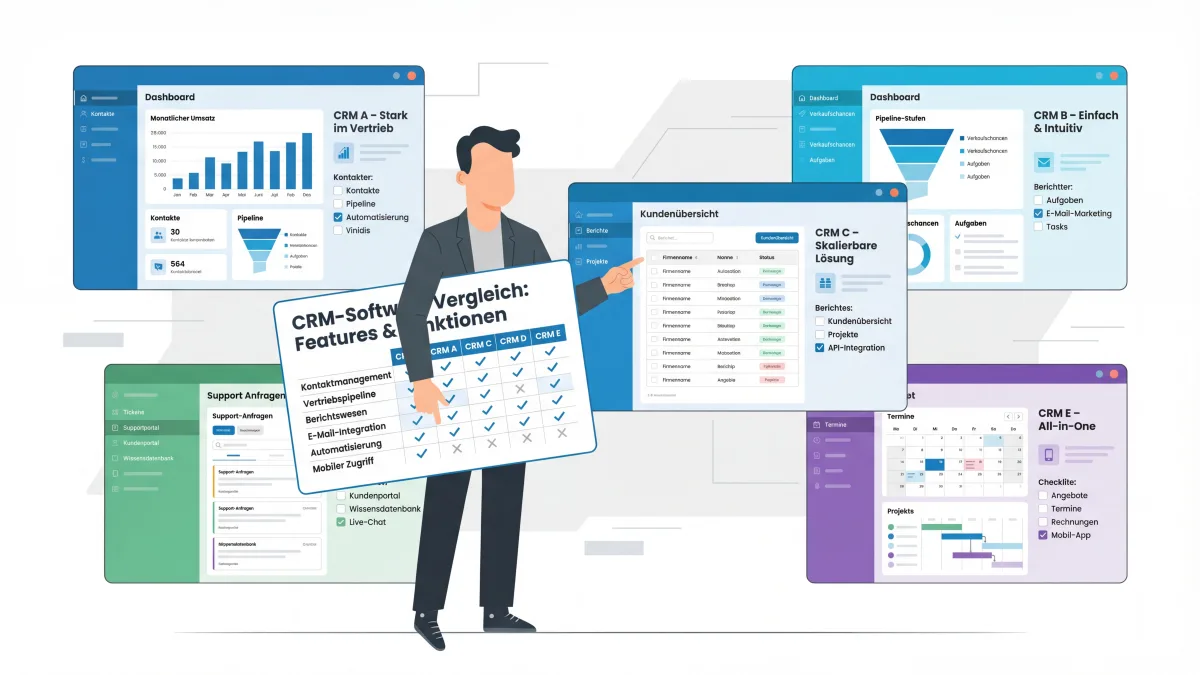 Dieser Artikel vergleicht die fünf relevantesten CRM-Systeme für Kleinunternehmen, zeigt die realen Kosten im ersten Jahr und gibt eine klare Entscheidungshilfe nach Unternehmenssituation.
