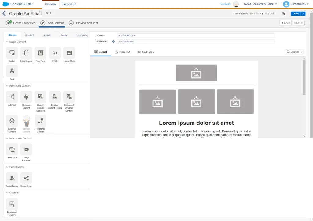 Der Content Builder zeichnet sich durch seine vielseitigen Funktionen zur professionellen Content-Erstellung aus. Durch die Integration von Content-Blöcken kannst du modulare Inhaltsbausteine erstellen und diese flexibel wiederverwenden.