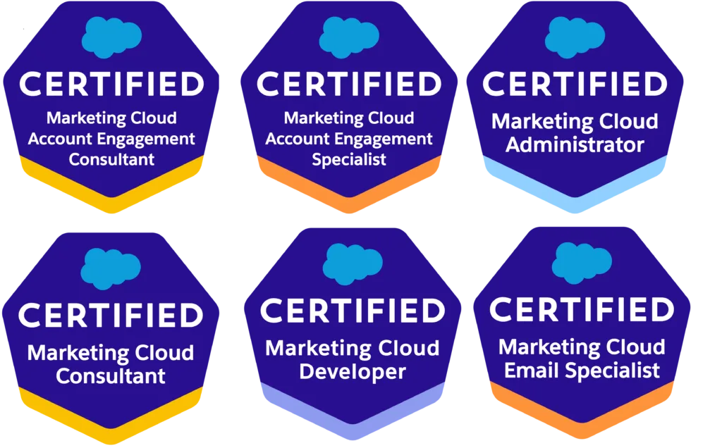 Zertifizierte Marketing Cloud Experten verfügen über umfassende Kenntnisse der Plattform und ihrer technischen Möglichkeiten. Die Qualifikationen umfassen mehrjährige Praxiserfahrung sowie spezielle Salesforce-Zertifizierungen.