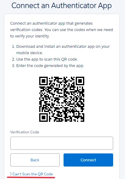 4. Auf dem Bildschirm “Connect an Authenticator App” klicken Sie auf “ I can’t scan the QR code”.