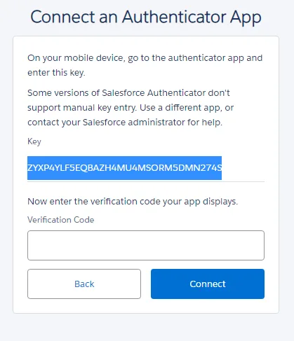 Registrieren Sie sich bei Authy, gehen Sie in Salesforce zu User-Profil > App Registration, kopieren Sie den Key (nicht QR-Code) und fügen Sie ihn in Authy ein.