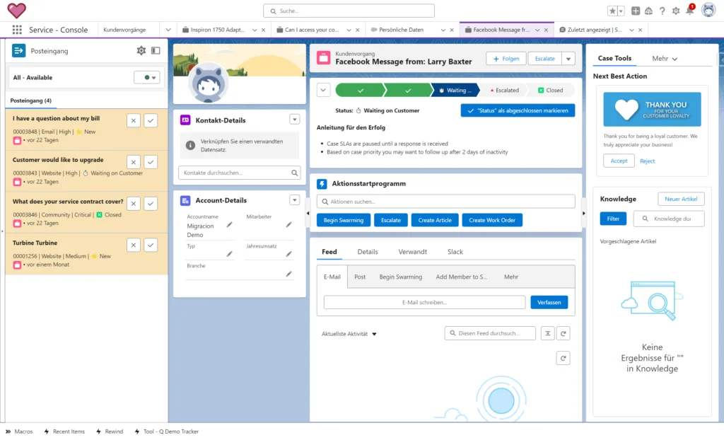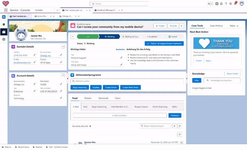 Die Service Console bietet eine intuitive Benutzeroberfläche, die durch anpassbare Workspaces und dynamische Seitenansichten überzeugt. Durch die clevere Anordnung von Tabs und Subtabs können Support-Mitarbeiter mehrere Fälle gleichzeitig bearbeiten.